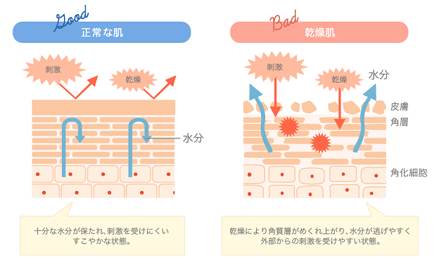 こうなると、お肌の内部の水分の逃げ出し、外部からの刺激や異物など入りやすくなってしまいますね。
